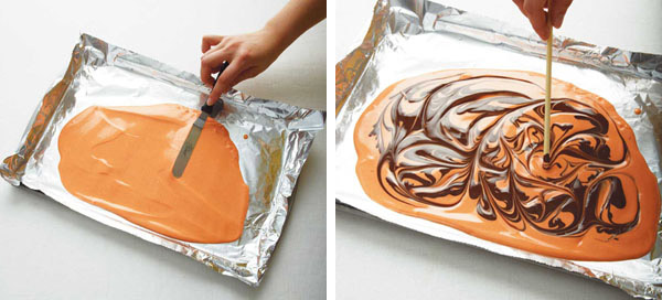 3. Echa el chocolate semi amargo sobre el chocolate naranja. Utiliza un palito de madera para que se forme como un marmoleado de naranja - marrón (chocolate).